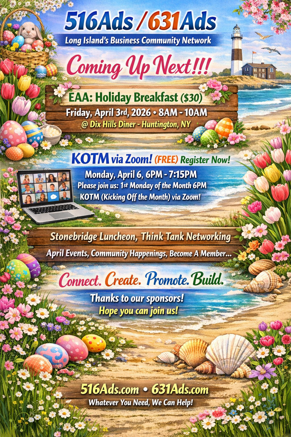 516Ads/ 631Ads & Entrepreneurs Across America are proud to be teaming up with Safe Haven Insurance, our friends @PURE Mammography, Island Better Hearing, Michelle Castelerio – On My Way Concierge, Sheryl Hecht – Douglas Elliman, Pam Landman – PMI Lighthouse /Squatter Watch & Oakwood Car & Tire Center for our EAA: Spring Into Action Holiday Breakfast @ Dix Hills Diner. Great people, amazing energy, excellent connections! $30 per person. Please RSVP. Hope to see you there!