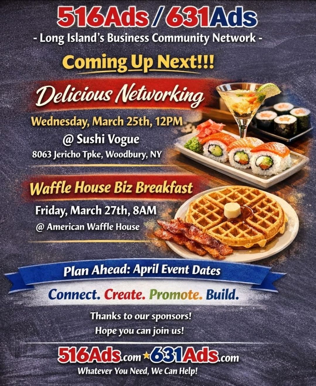 516Ads/ 631Ads are proud to team up with event sponsors Island Better Hearing, Giuseppe Di Bartolow/ Keller Williams Legendary, The Towles Group & Boris Mikhail, Financial Advisor at Edward Jones as we host ourBusiness Networking Breakfast @ American Waffle House. $30 per person. Please RSVP.Connect. Promote. Learn. Grow. Better your business. Hope to see you there!