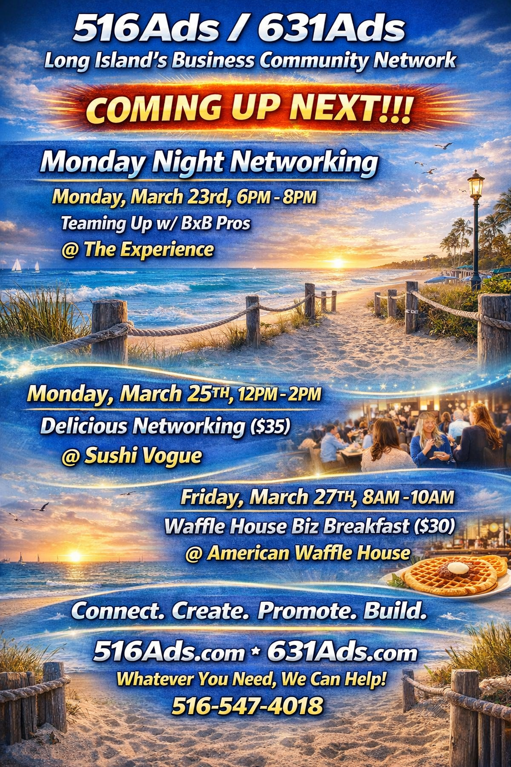 516Ads/ 631Adsare proud to team up with event sponsors Island Better Hearing, Giuseppe Di Bartolow/ Keller Williams Legendary, The Towles Group & Boris Mikhail, Financial Advisor at Edward Jones as we host ourBusiness Networking Breakfast @ American Waffle House. $30 per person. Please RSVP.Connect. Promote. Learn. Grow. Better your business. Hope to see you there!