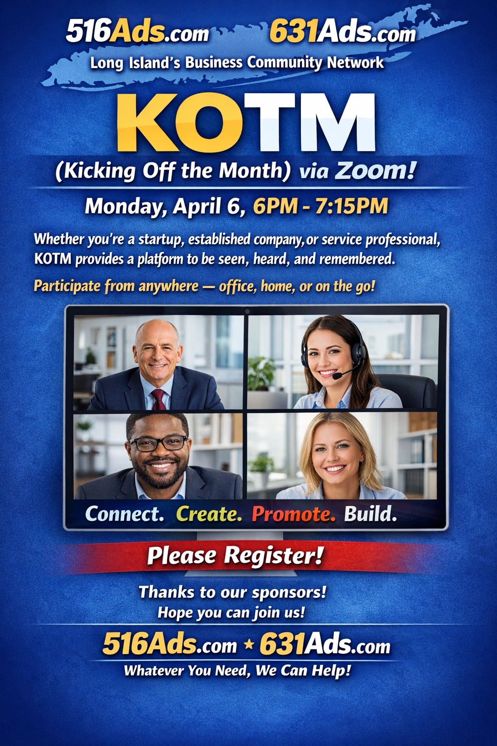 KOTM via Zoom! Monday, April 6, 6PM - 7:15PM Looking to grow your business? Please join us on the 1st Monday of the Month 6PM. KOTM (Kicking Off the Month) — meeting conveniently on Zoom! Thanks to Tom Paccione - TPAC Consulting & Ben Indiviglia - Douglas Elliman - Commercial for teaming up with us.