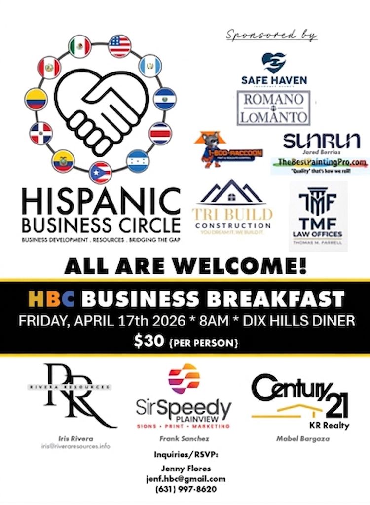 516Ads/ 631Ads are proud to team up withthe Hispanic BusinessCircle and event sponsors Safe Haven Insurance,Romano LoManto PLLC, TMF Law Offices, Tri Build Construction, TheBestPaintingPro / Handyman Services, Jared Berrios | Sunrun & our friends @ 1-800-Raccoon Pest & Wildlife Controlfor our HBCBusiness Breakfast @ The Dix Hills Diner. We’re honored to work with Jenny Flores, Mabel Barzaga – Century 21, Iris Rivera – Rivera Resources and Frank Sánchez – Sir Speedy/ Plainview on this program/ initiative. $30 pp. Please RSVP. Hope to see you there!