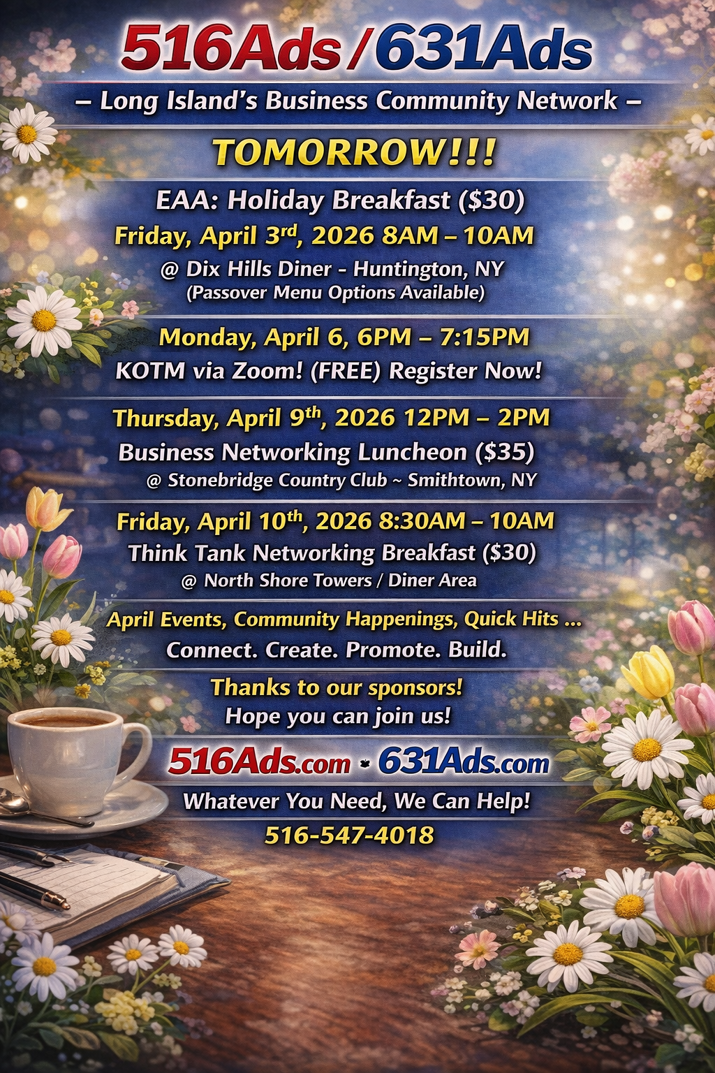516Ads/ 718Ads are proud to  team up with Giuseppe Di BartoloKeller Williams Legendary, Gerry Dolan’s –  Helping Hands Risk Solutions,our friends @ CDML (Computers Dominate My Life), Jim Nichols – Minuteman PressVesretta Homecare LLC for our Business Development Breakfast @ North Shore Towers. Connect. Promote. Get Ideas. Close deals.  $30 pp. Please RSVP. Hope to see you there!