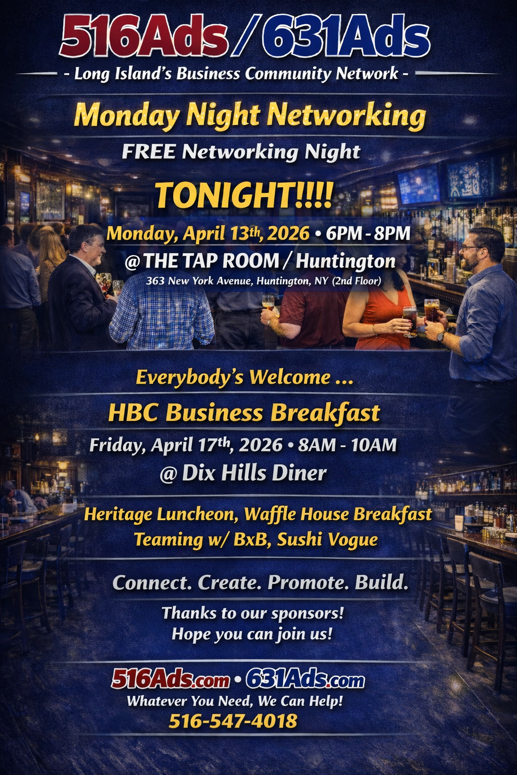 516Ads/ 631Adsare proud to team up with Betty Anne Smith of Howard Hanna | Coach Realtors, Michael Hirson – Legacy Advisors, our friends @ Safe Haven Insurance Agency,Herd Law Office, LLC., Sir Speedy / Plainview & Telecom / Text Message Marketing pros VoIPXas we host Monday Night Networking: FREENetworking Night @THE TAP ROOM / Huntington.Lite Apps. Cash Bar. Great people. Excellent connections. Get your week off to a great start! Hope to see you there!