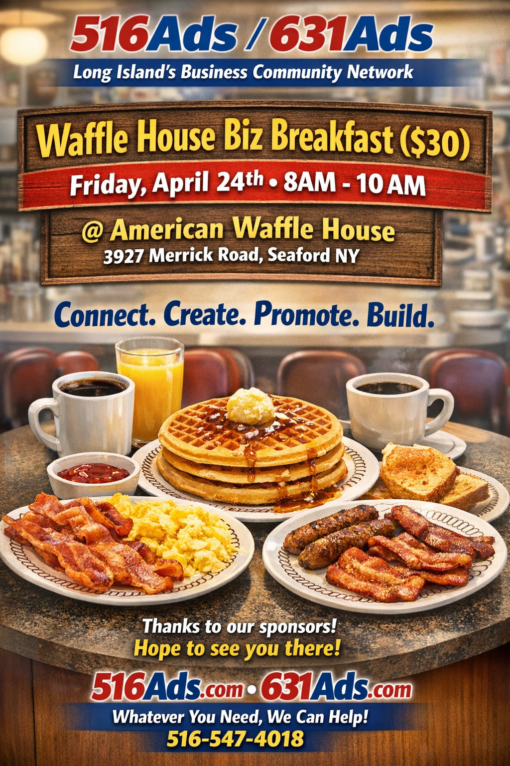 516Ads/ 631Adsare proud to team up with event sponsors Giuseppe Di Bartolow/ Keller Williams Legendary, The Towles Group, Boris Mikhail, Financial Advisor at Edward Jones& Frank Sanchez – Sir Speedy as we host ourBiz Networking Breakfast @ American Waffle House. $30 per person. Please RSVP.Connect. Promote. Learn. Grow. Better your business. Hope to see you there!